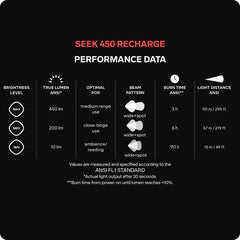 Den kraftfulla 450-lumen ljusstyrkan i en kompakt design med ett uppladdningsbart batteri gör Seek 450 Recharge till en praktisk pannlampa för både hundpromenader och toppklättring. Den avtagbara, rundade lampenheten och det smala, justerbara pannbandet säkerställer en bekväm passform och praktisk packbarhet. Pannlampan är tillverkad av återvunna material och har ett rött ljusläge för nattseende, låsläge och ett integrerat, uppladdningsbart batteri.